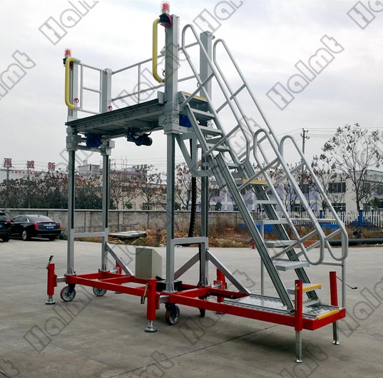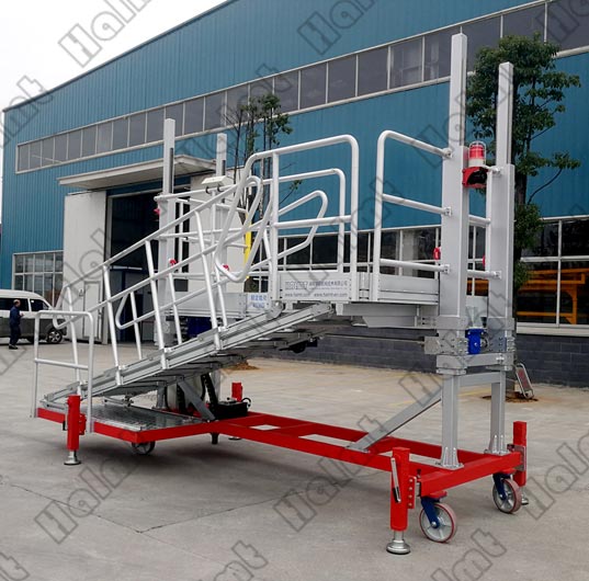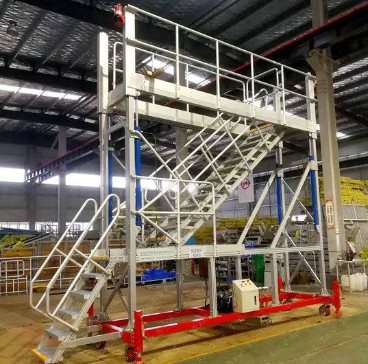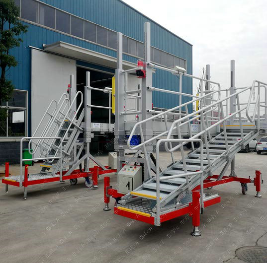 防滑鋁合金齒條踏步和平臺踏板,全包圍護欄設(shè)計,首末臺階警示條設(shè)計,與設(shè)備或建筑接觸處采用防撞橡膠條設(shè)計,更大程度保證人員和設(shè)備的安全。鋁合金結(jié)構(gòu),輕巧美觀,免維護,兩人即能完成轉(zhuǎn)場和移動。