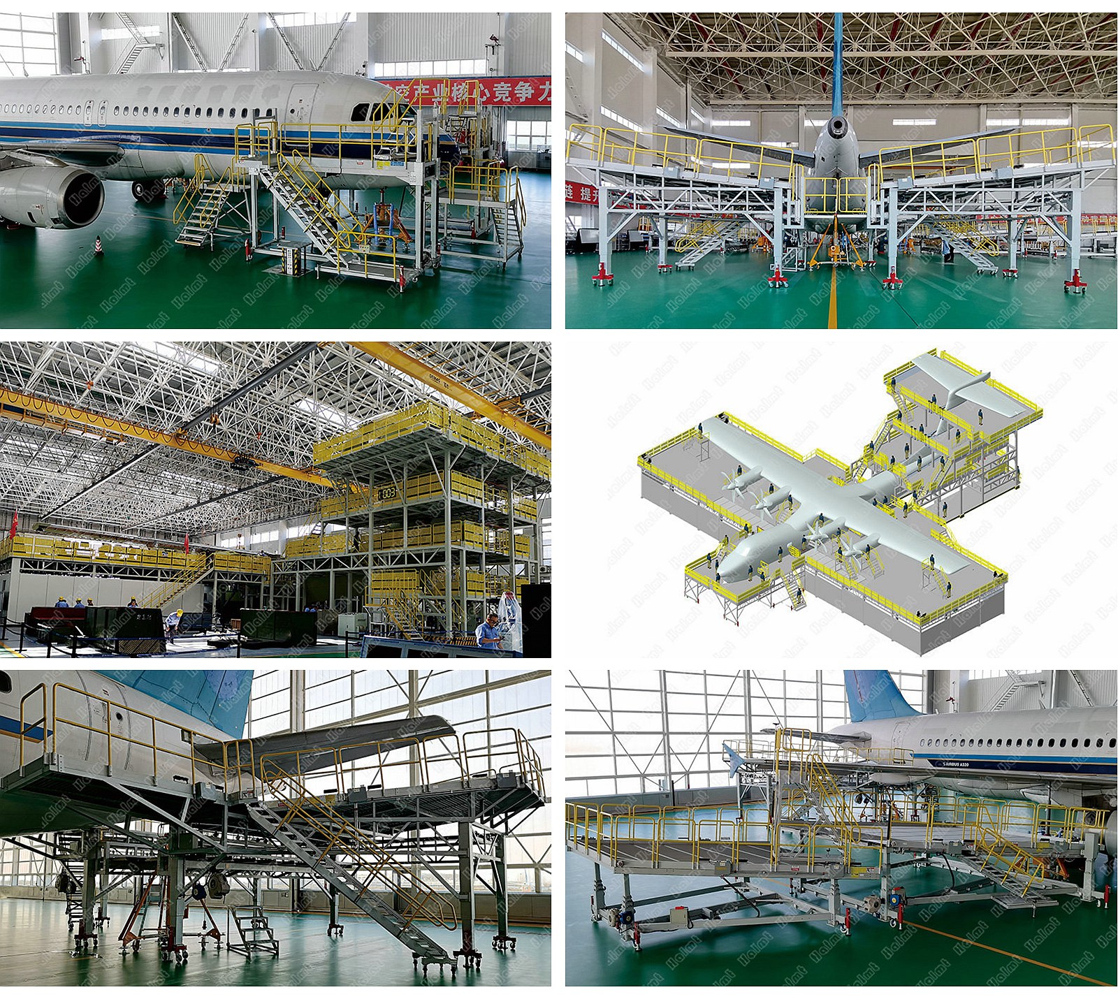 由我們公司設(shè)計(jì)研發(fā)的大飛機(jī)機(jī)塢系統(tǒng)分為兩大類,一類是大飛機(jī)的數(shù)字化智能裝配平臺(tái),可以實(shí)現(xiàn)飛機(jī)大部件的高效、準(zhǔn)確和可靠的裝配。另外一類是大飛機(jī)的維修平臺(tái),為飛機(jī)維修的便利、可靠和安全創(chuàng)造基本條件。產(chǎn)品采用模塊化3D設(shè)計(jì),組合分拆便利,大限度減少對(duì)地面人車行走的阻礙,可以為不同機(jī)型量身定做。